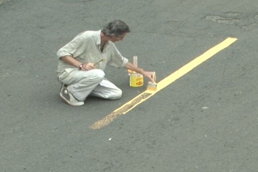 Many of his works involve observation and recording of the social, cultural and economic fabric of specific locations, commonly taking place during walks through urban areas. Citing the act of walking as the centre of his practice, for his first performance The Collector (1991), he dragged a small magnetic toy dog on wheels throughout the streets of Mexico City so as to collect any metallic residue lying in its path. In Fairy Tales (1995), he takes a walk after unravelling the sweater he has on, leaving an ever-lengthening, blue-thread trail in his wake. Also in 1995, Alÿs realized an action in São Paulo called The Leak in which he walked from a gallery, around the city, and back into the gallery trailing a dribbled line from an open can of blue paint. This action was reprised in 2004 when Alÿs traced a line of paint following the 1948 cease-fire border in Jerusalem, known as ‚the green line‘, carrying a can filled with green paint. The bottom of the can was perforated with a small hole, so the paint dripped out as a continuous squiggly line on the ground as he walked.The work Paradox of Praxis 1 (Sometimes Making Something Leads to Nothing) documents an action performed on the streets of Mexico City in 1997. The film depicts a simple and seemingly pointless endeavour, where a large block of ice is pushed through the city streets for nine hours until it melts away to a puddle of meltwater.