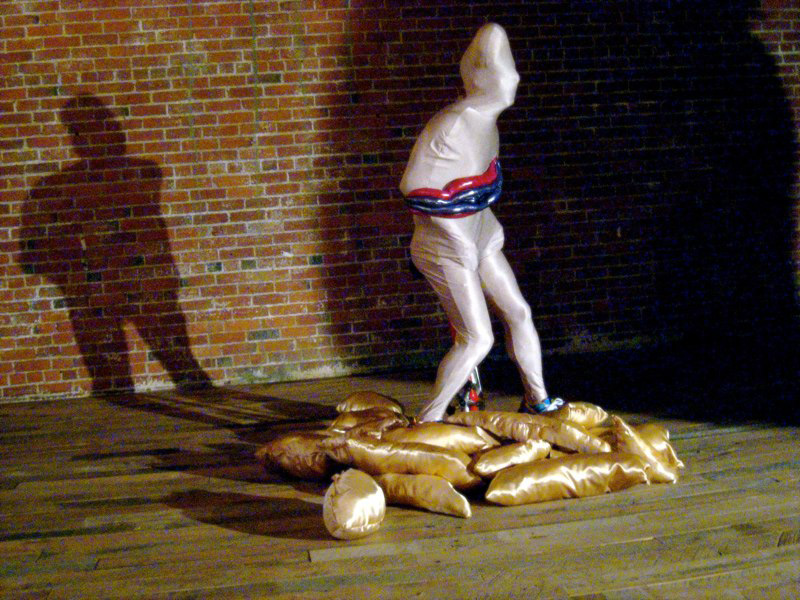 I take a sculptural approach to creating time-based art. I look at time, space, and body through a sculptural lens. Transformative or interactive costumes and objects aid me in a quest to re-invent my anatomical design, corrupt or distort it…call it into question.