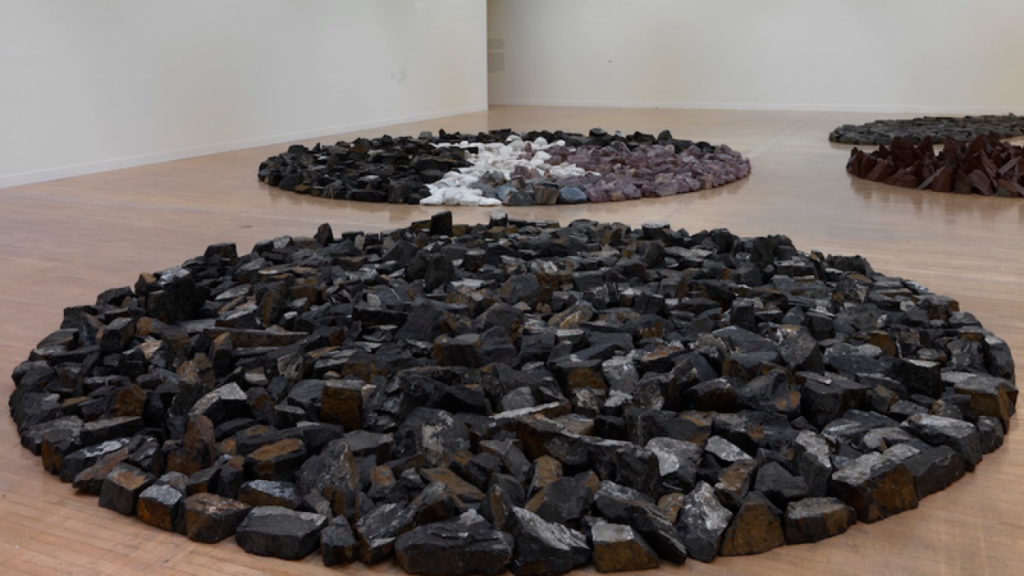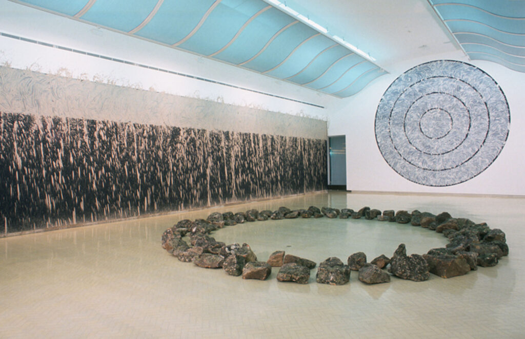 After 1969, Long began making journeys and sculptures in wilderness places all around the world. In the 1980s, Long began making new types of mud works using handprints applied directly to the wall. He also continued to make large sculptures of lines and circles from slate, driftwood, footprints or stone, often sourced from quarries near the exhibition sites. Long mediates on his experience of these places, from mountains through to deserts, shorelines, grasslands, rivers and snowscapes, according to archetypal geometric marks and shapes, made by his footsteps alone or gathered from the materials of the place. These walks and temporary works of passage are recorded with photographs, maps and text works, where measurements of time and distance, place names and phenomena are vocabulary for both original ideas and powerful, condensed narratives.“